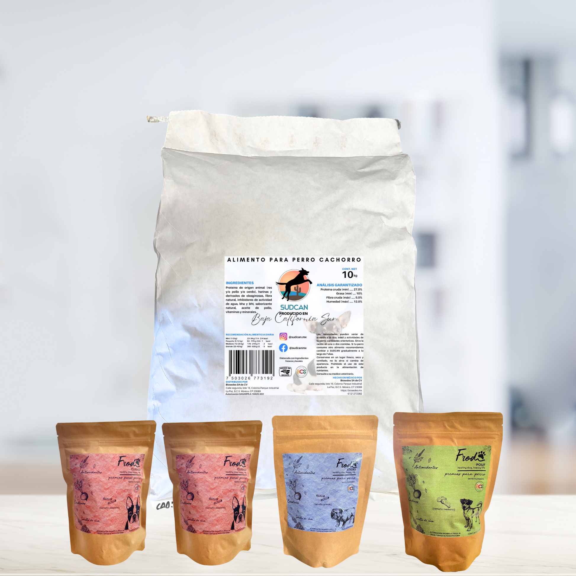 El paquete #5, ideal para un lindo cachorro en esta importante etapa de desarrollo, un gran balance de croquetas SUDCAN y nutritivos premios FROD.